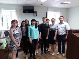 Біля самого входу з вітальним словом до учнів звернулися керівник апарату суду Ізіменко Валентина Володимирівна та заступник керівника апарату Головко Вікторія Костянтинівна і провели їх до кабінету голови суду Пустовар Оксани Савеліївни, яка продемонструвала учням символи судової влади, які є обов’язковими атрибутами судового процесу: мантія та нагрудний знак. Окрім цього Оксана Савеліївна розказала учням про деякі особливості розгляду судових справ, поняття нарадчої кімнати, можливості відео конференцзв’язку, види судових рішень, правила поведінки під час судового процесу і т.д.